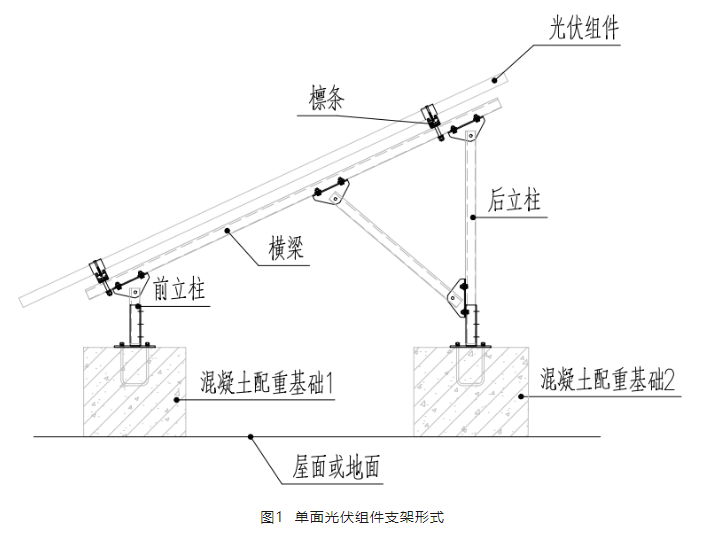 該支架體系由前后兩根立柱支撐一根橫梁,沿橫梁縱向搭設檁條,檁條之上通過壓塊將組件固定。該體系通過前后立柱的混凝土配重墩固定在屋面或者地面上。結構橫向由斜撐形成固定體系,縱向由混凝土基礎和檁條形成固定體系。經眾多實際項目驗證,該結構體系能滿足光伏使用的結構安全需要。