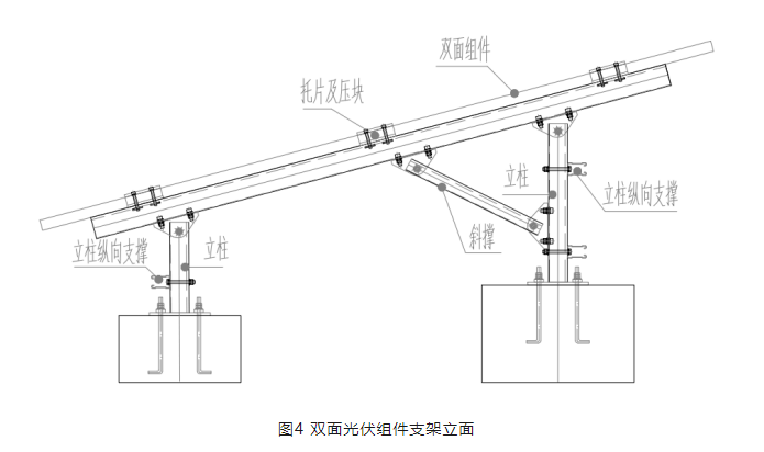每塊光伏組件兩側均設置橫梁,組件通過壓塊和托片固定到橫梁上,橫梁通過前后立柱固定到基礎上。為了保證結構側向的穩定,前立柱沿縱向設置一根縱向支撐,后立柱沿縱向設置兩根縱向支撐,雙面光伏組件支架立面如圖4所示。該支架結構體系取消縱向檁條,有效的避免了其對組件背面的遮擋。同時立柱設置的縱向支撐,提供了支架縱向的剛度,使支架在縱向形成穩定的支架體系。具體安裝效果詳見第7節應用案例。