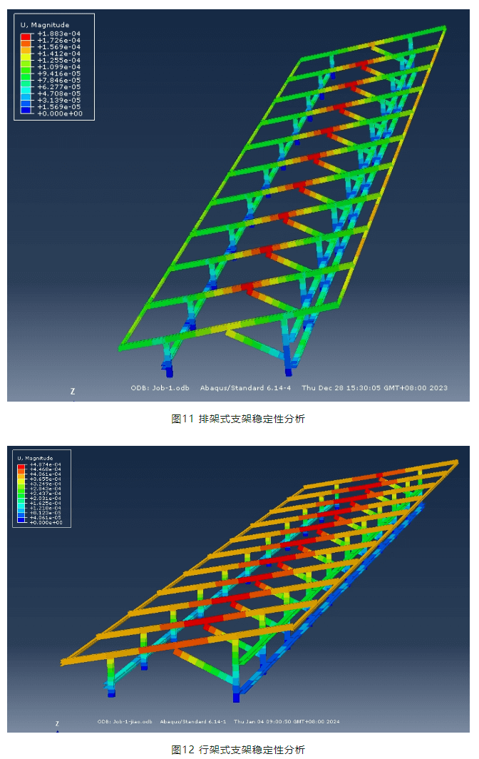 需要指出,排架式支架比行架式支架結構約束更多,超靜定次數更高,因此結構位移小,穩定性好。從結構穩定性角度,本文推薦采用排架式支架結構體系。