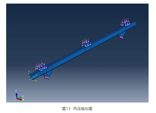 為驗證壓塊與橫梁節點部位的受力,取一根橫梁采用三維應力單元進行仿真分析。風荷載施加到壓塊上,通過壓塊傳遞給橫梁,三角連接件底部設置固定支座,見圖13,橫梁通過三角支座固定。
