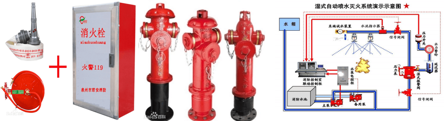 室內消火栓滅火系統由水源、泵站、管網、水泵接合器及消火栓等組成,按加壓方式可分為超高壓消火栓系統、臨時高壓消火栓給水系統及低壓消火栓給水系統。