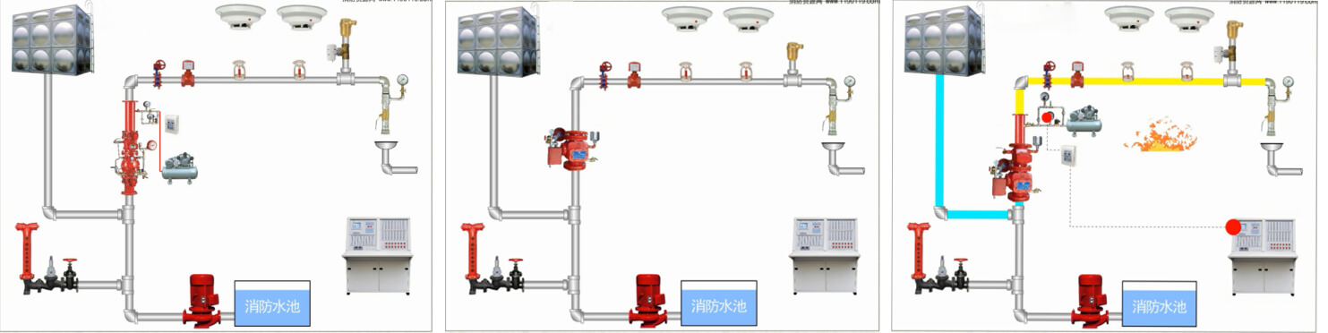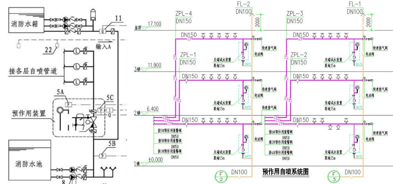 預作用自動噴水滅火系統系統原理圖以及實際項目系統圖如下所示: