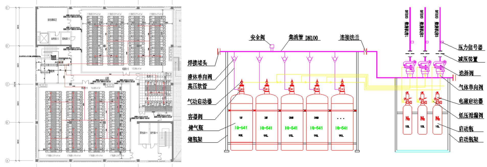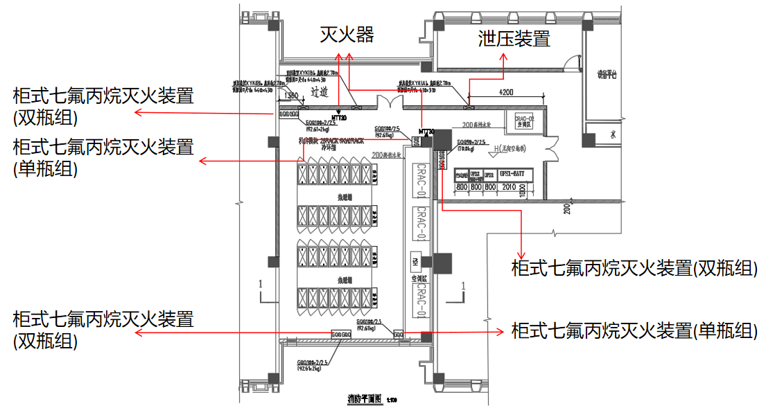 氣體滅火系統是以氣體作為滅火介質的滅火系統,主要有七氟丙烷和IG-541兩種滅火系統。其具有滅火范圍廣(電氣,固體,液體等火災),釋放速度快,滅火效率高,滅火后基本不留痕跡,對被保護對象無污染無損害等的特點。