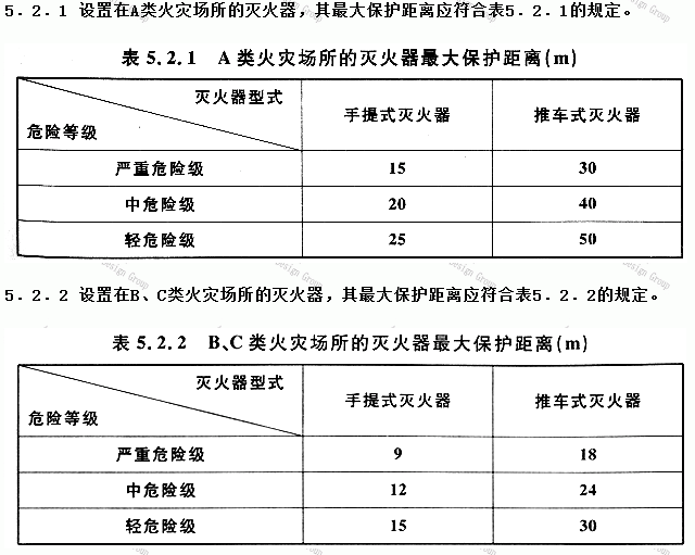 《建筑滅火器配置設計規范》GB50140-2005中關于滅火器最大保護距離的規定如下: