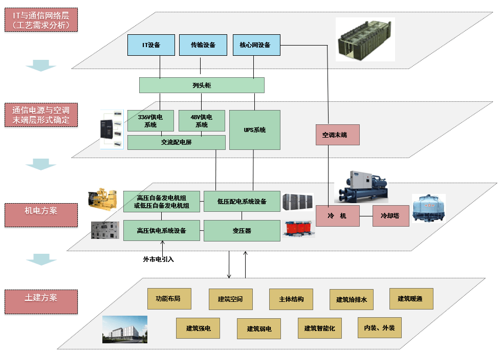 數據中心的建筑設計流線主要分為運營流線,設備運輸流線,機房參觀流線,每個流線應避免交叉,機房的流線主要圍繞數據機房來設計,其中,高壓機房、分界室、并機室、冷凍站、ECC監控室、通信機房等主要布置在首層位置,二層及以上根據數據機房的布置,布置相應的低壓機房、電池室、UPS間等;