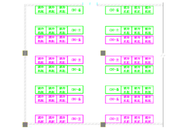 3)將CDU集中布置到一個(gè)區(qū)域或者集中到幾個(gè)有序區(qū)域,使液冷設(shè)備管路和冷卻水管路有明確的物理分區(qū),一方面可以使各功能區(qū)有序布局,另一方面能夠更加簡(jiǎn)潔的實(shí)現(xiàn)冷卻水管路和閥門冗余設(shè)計(jì)。