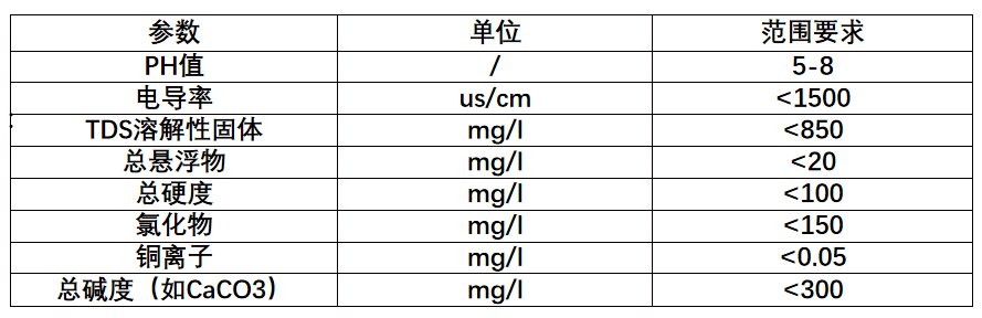 2、機房改造時,需根據水源水質條件,選擇合理的水處理工藝。間接蒸發冷卻空調設備補水水質應滿足《采暖空調系統水質》GB/T 29044-2012第4.4條規定。具體到廠家產品可有不同的水質要求,但應高于規范要求。以海悟產品為例,海悟AHU間接蒸發冷卻節能機組補水需滿足的水質指標如下: