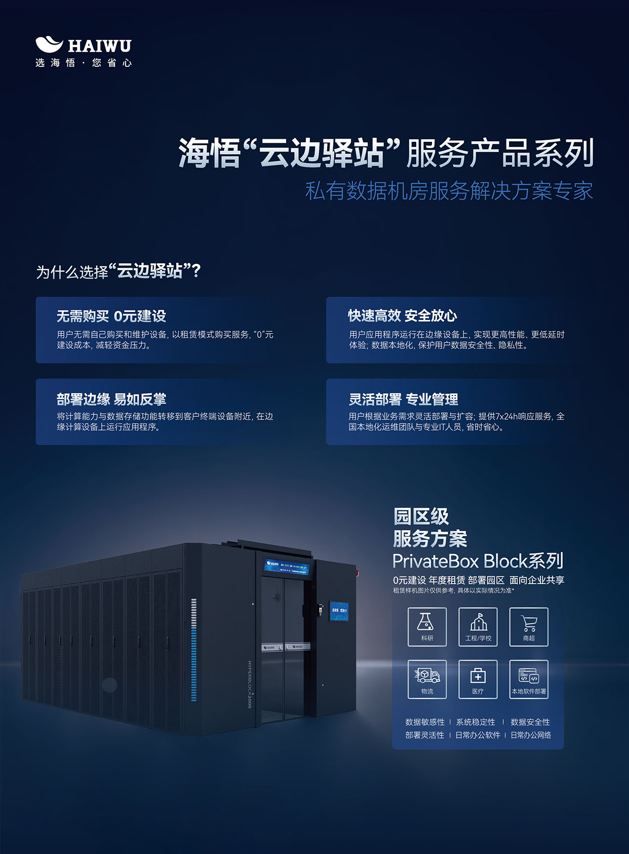 海悟云“云邊驛站”園區本地化私有數據機房托管服務解決方案,以高效、安全、靈活、經濟的優勢,助力中小型企業輕松應對算力時代的挑戰。我們期待與您攜手,共同開啟數據管理的新篇章!