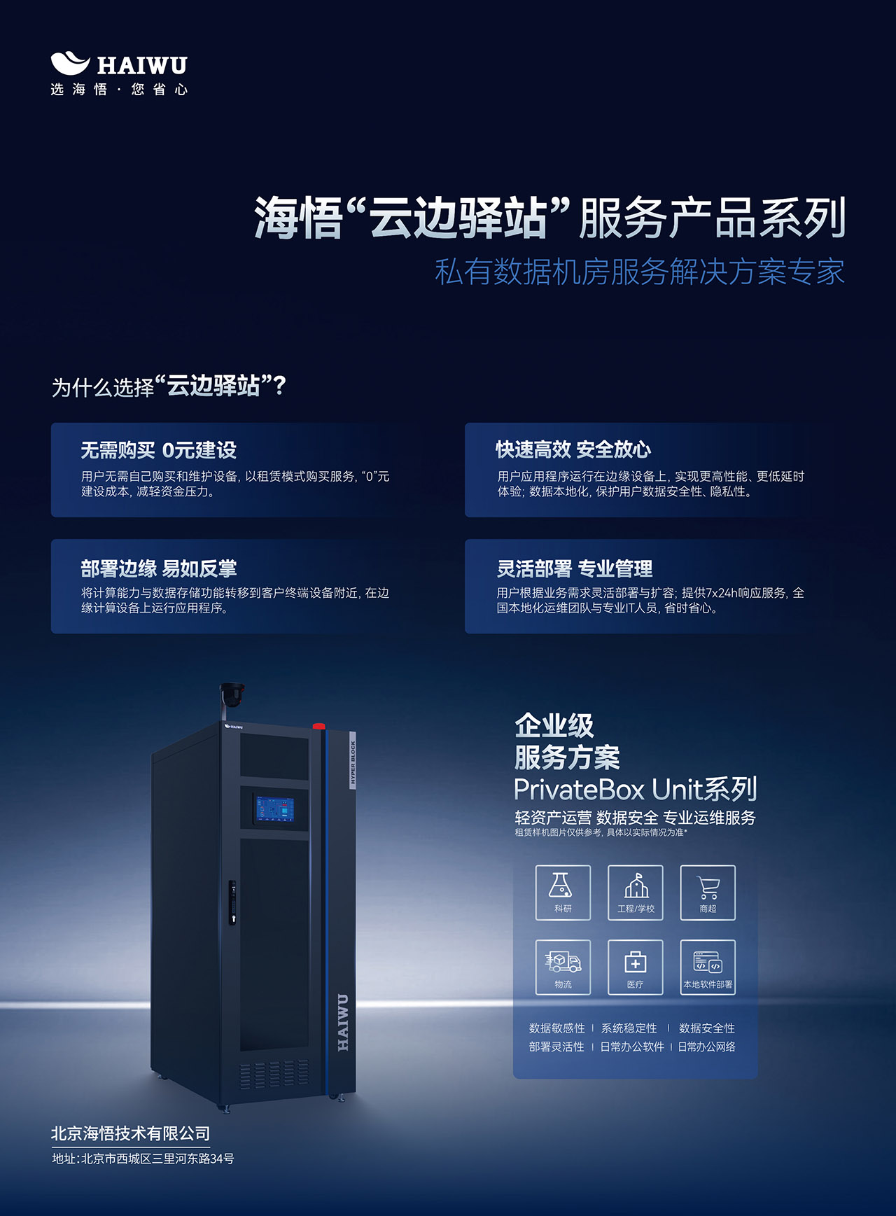 在這樣的背景下,海悟云 “云邊驛站” 企業(yè)級(jí)本地化私有數(shù)據(jù)機(jī)房托管服務(wù)解決方案橫空出世,為企業(yè)帶來了全新的選擇。海悟云云邊驛站為企業(yè)提供全生命周期本地私有數(shù)據(jù)機(jī)房基礎(chǔ)設(shè)施托管服務(wù),精準(zhǔn)針對(duì) laas 基礎(chǔ)設(shè)施層,提供軟件所需的硬件資源,包括 cpu、存儲(chǔ)、網(wǎng)絡(luò)、配電、制冷等,硬件涵蓋服務(wù)器、機(jī)柜、交換機(jī)、ups、虛擬機(jī)、配電等。