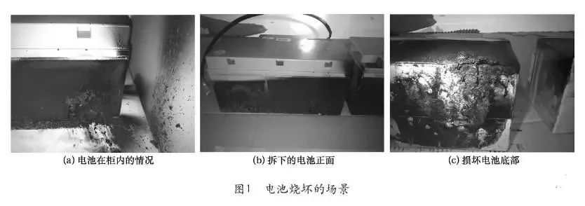 ①XX企業(yè)的二臺(tái)30kVAUPS,電池是12V/65Ah,其中一臺(tái)發(fā)生電池起火冒煙。煙霧非常大,整個(gè)配電室全是煙霧,電氣工作人員帶防毒用具進(jìn)入配電室進(jìn)行操作,因未見明火,消防隊(duì)到現(xiàn)場(chǎng)沒有處置,由電氣工作人員進(jìn)行操作,用風(fēng)機(jī)排煙。現(xiàn)場(chǎng)情況是UPS轉(zhuǎn)旁路工作,有幾塊電池?zé)龎摹D1為電池?zé)龎牡膱?chǎng)景。